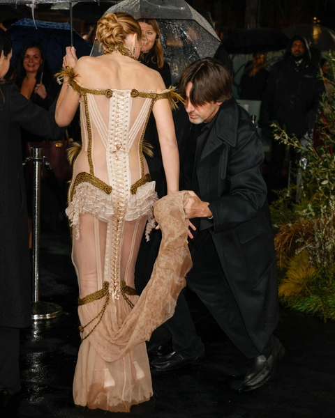 За эти драматичные, роковые и сексуальные наряды, как и в случае с «Барби», отвечает стилист Эндрю Мукамал. Делать обзор на все шедевры пока не будем — сохраним интригу, но про аутфит с лондонской премьеры не упомянуть будет преступлением. Актриса появилась на красной дорожке, усыпанной полевыми цветами, в полупрозрачном корсетном платье Dilara Findikoglu, украшенном декоративными светлые косами, и туфлях Manolo Blahnik.