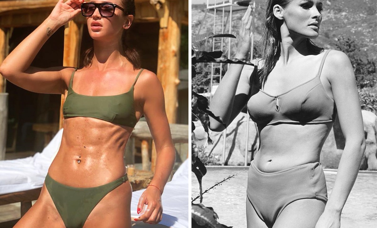 Лаконичный купальник Ольги Бузовой нельзя назвать старомодным, скорее звезда выбрала базовую модель, которая была актуальна во все времена. Взгляните на икону стиля конца 1960-х Урсулу Андерс в бикини, немного отличающимся от пляжного выбора нашей современницы лишь моделью плавок: более высокое декольте бедра стало актуальным лишь пару десятилетий спустя. Крой верха же практически идентичен – оба купальника по крою напоминают скорее маечку, чем бюстгальтер, и лишены каких-либо спецэффектов