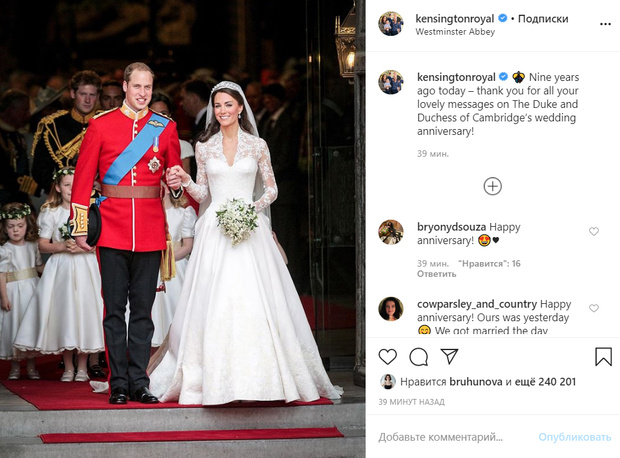 В эту среду Кейт и Уильям отмечают 9-ю годовщину со дня свадьбы. Поклонники британской королевской семьи уже с ночи засыпают соцсети пары поздравлениями и счастливыми пожеланиями.