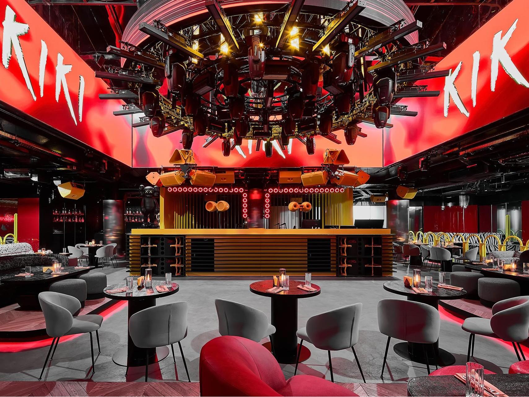 Центр KiKi Event Dom — танцпол с самой большой в России диджейкой, которая легко превращается в сцену для артистов. Здесь же расположен бар из натурального агата — один из главных визуальных акцентов площадки. Над ним работает система подачи настоящего снега, и каждый коктейль выглядит как часть перформанса. Лаунж-зоны с мягкими диванами, кинетический свет и четыре панорамных экрана, расположенные над танцполом, создают эффект полного погружения и живую, постоянно меняющуюся атмосферу.