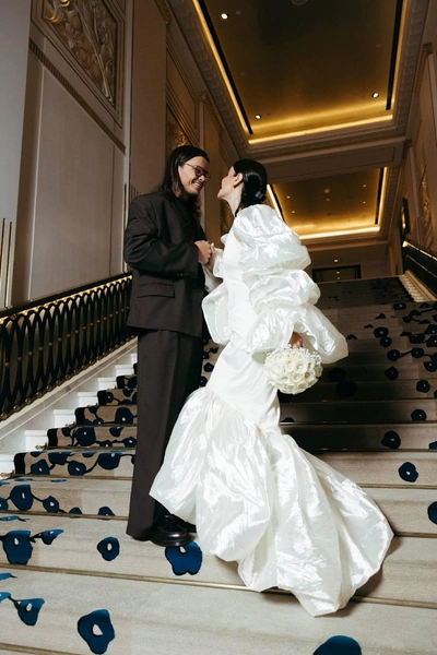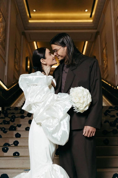 Невеста выглядела эффектно: белое платье с объемными рукавами и выразительным архитектурным кроем подчеркивало фигуру, а пышный подол добавлял образу драматичности. Минималистичный букет из белых роз поддержал концепцию элегантной сдержанности. Волосы были собраны в гладкую прическу, а макияж — максимально естественным. Жених выбрал темный костюм свободного силуэта с удлиненным пиджаком и рубашкой в тон. В целом образ получился современным и слегка брутальным, что контрастировало с нежностью невесты.