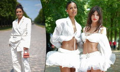 Обновите гардероб к июлю, вдохновляясь с шоу. Белоснежный брючный костюм можно комбинировать с самой контрастной сумкой и туфлями на массивной платформе. Воздушный топ дополняйте такой же юбкой или классическими белыми джинсами — это самый универсальный дуэт на каждый день. А соблазнительные блузы с рукавами-фонариками стоит носить нараспашку, чтобы было видно белый бралетт.