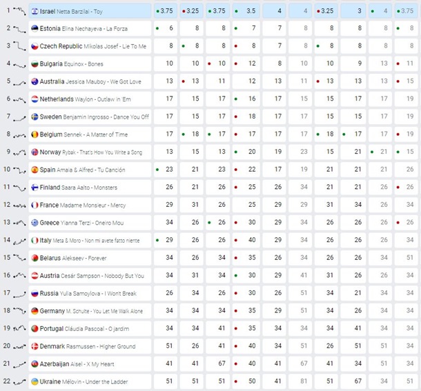 На второй позиции идет представитель Чехии Миколаш Йозеф с композицией Lie to Me. А замыкает тройку лидеров Элина Нечаева из Эстонии (песня La Forza).