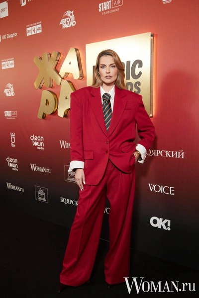 Саша Савельева устроила модный твист, примерив oversize-костюм — немного офисный, немного подиумный и максимально уверенный. Лук в стиле офисный шик: объемный алый костюм с подчеркнуто широкими плечами и галстуком. Образ балансирует между маскулинностью и хрупкостью, превращая строгий дресс-код в модное заявление.