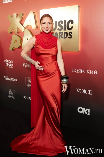 Анна Асти стала воплощением современной дивы — ее струящееся платье цвета расплавленного рубина обволакивает фигуру, мягко играя на свету, а акцентный шарф и массивные украшения добавляют образу кинематографичности, делая выход не просто эффектным, а по-настоящему запоминающимся, где Анна безусловно в главной роли.