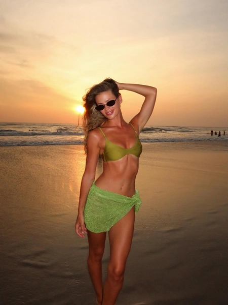 На этот раз экс-супруга внука Аллы Пугачевой выбрала для съемок не гламурный городской пейзаж, а дикую природу: закатное небо, теплый песок пляжа и океанский прибой. На снимках Краснова позирует в лаймовом бикини и солнцезащитных очках.