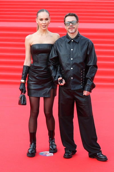 Зоя Фуць, жена Павла Деревянко, ступила на красную дорожку в совершенно ином настроении — дерзко-рокерском. Не только сама оделась в кожу и затянула себя в корсет, но и звездному супругу выдала куртку со шнуровкой. Спасибо, что не на мотоцикле заехали к театру «Россия».