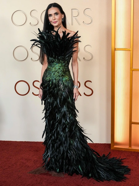 Не исключено, что пройдет еще пара лет, и «Оскар» окончательно забудет про экспериментальный гранж и «голые» платья, ограничившись спокойными оттенками и силуэтами, однако звезды, которые готовы выделиться, останутся всегда. В этом году миссию блистать ярче всех взяла на себя Деми Мур, которая стала одной из самых обсуждаемых персон премии через секунду после того, как появилась на ковровой дорожке. Во-первых, она выбрала кастомное платье из новой коллекции Gucci — из черно-зеленых переливающихся перьев. Над его созданием трудился Демна Гвасалия, ставший креативным директором бренда совсем недавно — осенью 2025 года