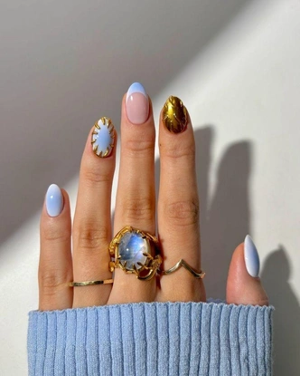 Холодный ледяной голубой — фаворит сезона, который идеально сочетается со всем. Но лишь с золотом он создает по-настоящему денежный дуэт. Поэтому берите их за основу и смело комбинируйте техники. Например, на сделайте на одном ногте классический френч, на другом — плавное омбре-ауру, на третьем — золотую втирку. Хром или объемные золотые элементы для акцента тоже приветствуются. Такой денежный маникюр на март 2026 года работает на привлечение ясных идей и дорогих возможностей, ведь свежесть голубого тут органично сливается с силой золота.