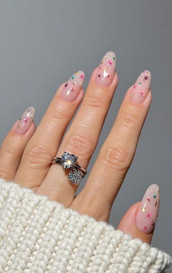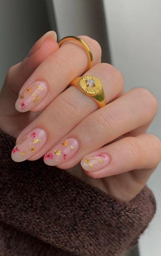 Этот дизайн напоминает изящное кружево или тонкий морозный узор, сохранившийся с зимы. Ведь мелкие разноцветные сухоцветы на прозрачной или нюдовой базе выглядят так же нежно, красиво и деликатно. А если добавить к ним несколько маленьких кусочков золотой потали, можно получить идеальный символ хрупкого баланса между прошлым и будущим, где каждая деталь означает новый рост. Такой денежный маникюр на март 2026 мягко привлекает изобилие, напоминая, что даже самые небольшие начинания могут привести к процветанию.