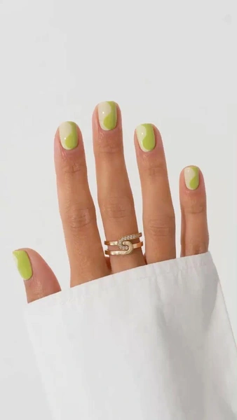 Яркий оттенок акации прекрасен сам по себе, но в геометрическом дизайне он раскрывается по-новому. Прямые линии или абстрактные рисунки, дополненные родственными оттенками зелени, создают эффект сочного, спелого плода. Такой денежный маникюр на март 2026 выглядит современно и символизирует активный рост и притяжение свежих, «вкусных» финансовых возможностей.