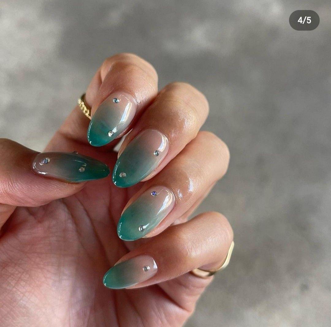 Этот дизайн — образец сдержанной роскоши. Поэтому если вам нравится сдержанность и более темные оттенки, то это ваш вариант. Создайте плавное омбре от прозрачного основания к насыщенному оттенку александрита на кончиках. Особенно изысканно этот переход будет смотреться на миндалевидных ногтях, как бы напоминая огранку драгоценного камня. А если к этому добавить еще несколько мелких страз — буквально по 1-2 на ноготь, игра света станет еще эффектнее. Этот денежный маникюр на март 2026 точно поможет настроиться на стабильное, престижное благополучие, ведь он олицетворяет глубину, мудрость и ценный, выверенный подход к финансам.
