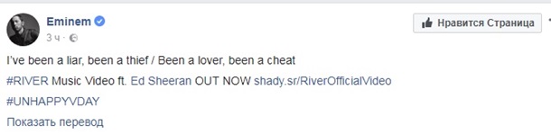 Американский рэпер Эминем выпустил клип на песню River, записанную при участии британского музыканта Эда Ширана. Об этом Эминем сообщил на своей странице в Facebook в среду, 14 февраля.