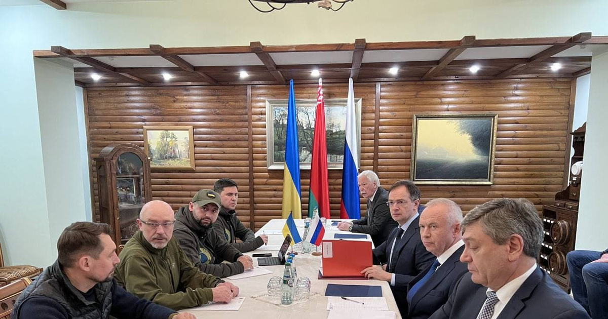 Первый раунд переговоров 28 февраля. С украинской стороны на них приехали министр обороны, глава фракции «Слуга народа» в Верховной Раде и замглавы МИД. Россию представляли помощник президента Владимир Мединский, замглавы МИД Андрей Руденко, замглавы Минобороны Александр Фомин, глава комитета Госдумы по международным делам Леонид Слуцкий и посол России в Белоруссии Борис Грызлов. Журналистов на встречу не пустили.