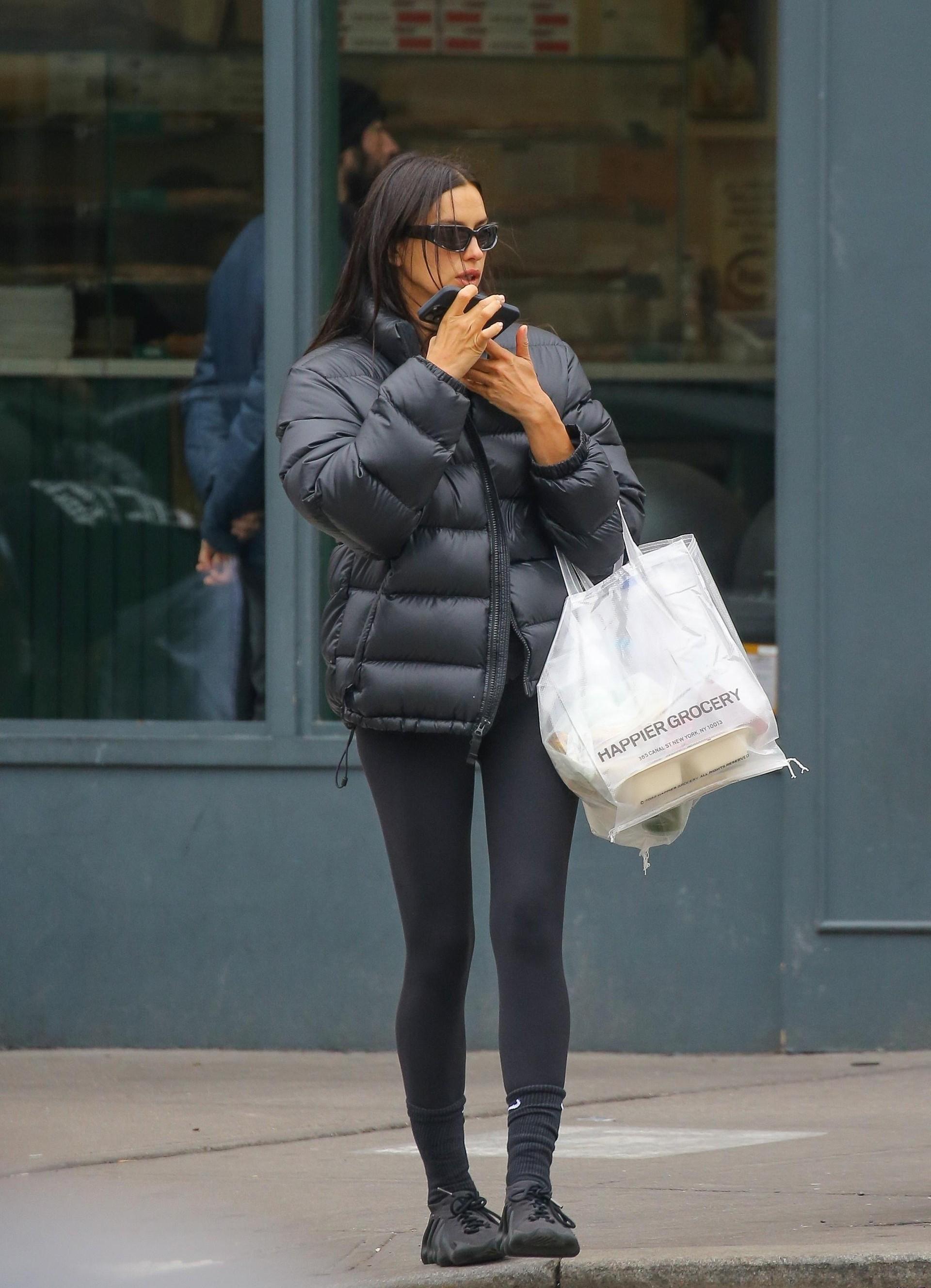 Кстати, о шопинге. Благодаря стритстайл-фотографам мы теперь знаем, где закупается продуктами наша соотечественница Ирина Шейк. Конечно, свои любимые русские конфеты, пельмени, закрутки и прочие наши продукты она, скорее всего, приобретает в специализированных магазинах или получает от родных и друзей, а вот все остальное явно из премиального супермаркета Happier Grocery, где все от экологически чистых брендов и местных органических ферм. Такой повседневный шопинг требует соответствующего лука — базовых черных лосин, носков, кроссовок, пуховика и очков.