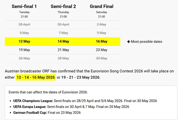 В настоящее время организаторы конкурса вероятные даты проведения следующего шоу. Согласно информации сайта Eurovisionworld, полуфиналы и грандфинал традиционно пройдут в мае. Рассматриваются два возможных варианта: