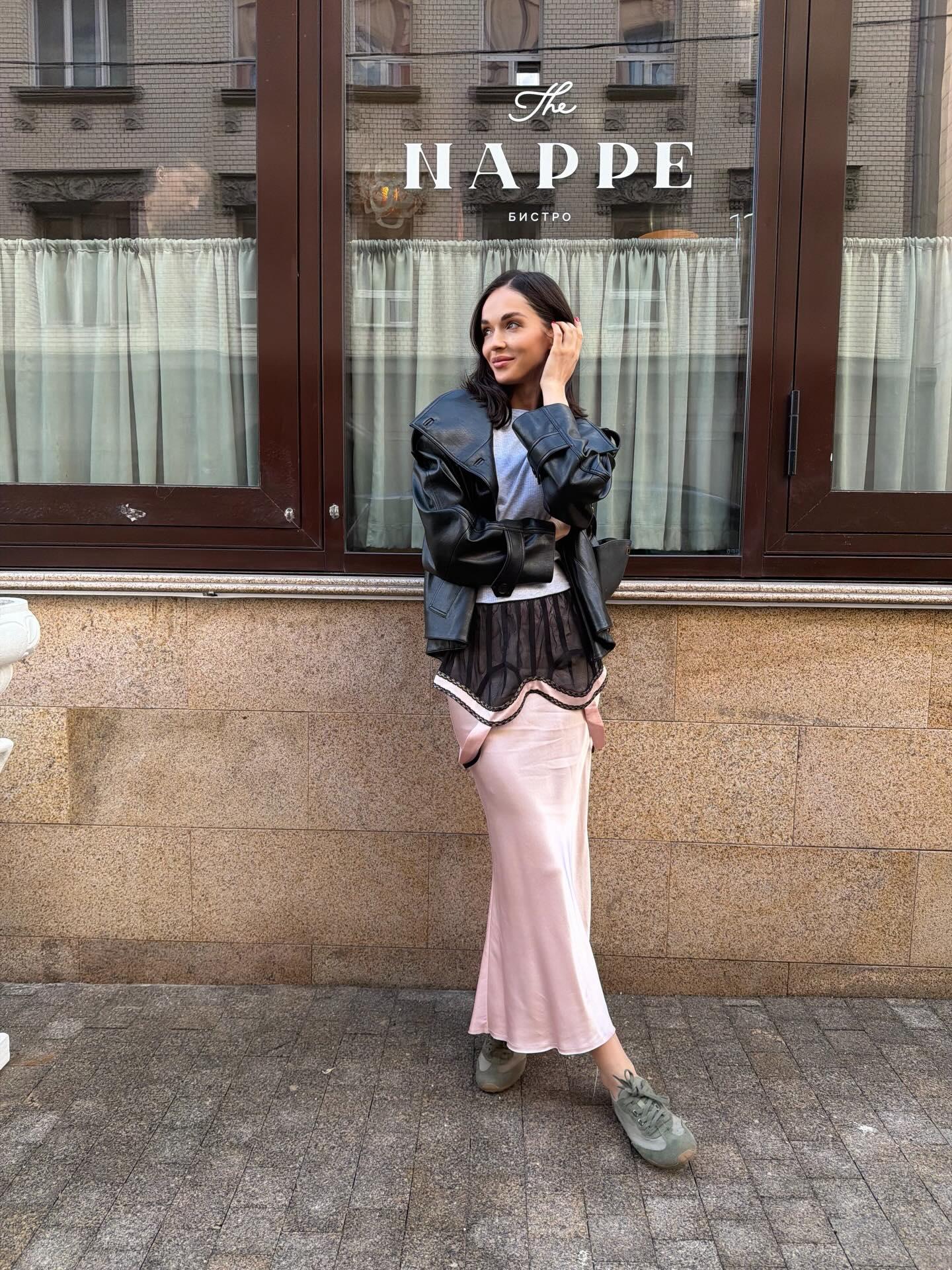 Софья Синицына меняет лишь модели, а составляющие ее образов остаются неизменными — это укороченная кожаная куртка, легкое платье в бельевом стиле и кроссовки на плоской подошве