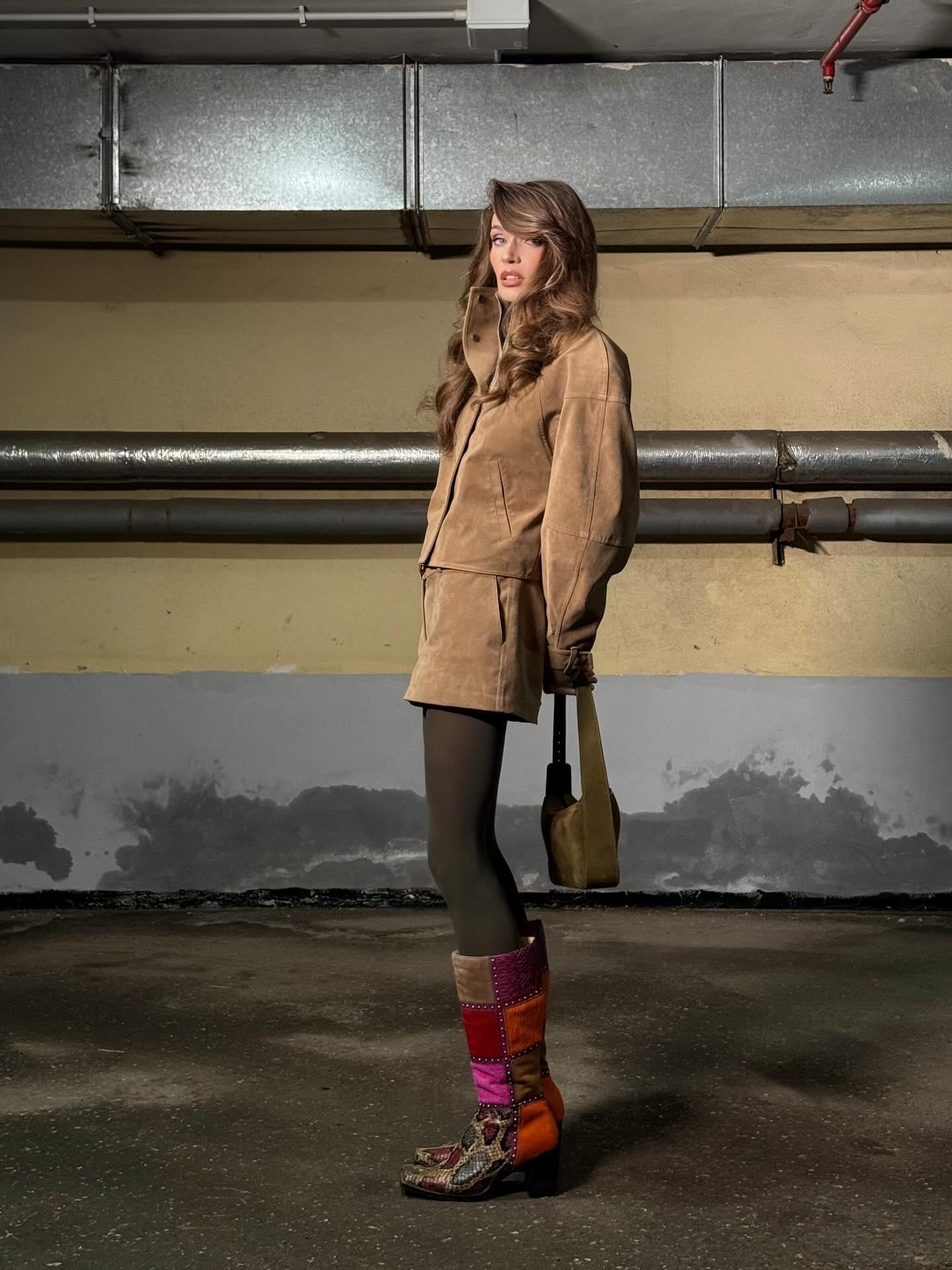 Алена Водонаева не любит следовать чьим-то советам и все делает по-своему, хотя, стоит отметить, что порой ее стилизации выглядят не хуже, чем у известных фэшн-инфлюенсеров. Например, этот замшевый бежевый костюм с мини и бомбером смотрелся очень удачно с болотными колготками, оливковой мини-сумкой из того же материала и яркими сапогами, сделанными из ярких лоскутков.