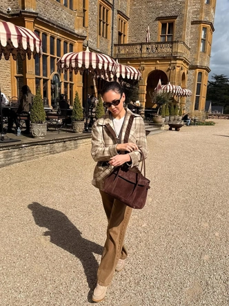 Виктория Лопырева весной-2026 тоже делает ставку на модные оттенки коричневого и базу, но не совсем обычную. Например, вместо прямого оверсайз жакета-пальто она выбирает приталенную модель, вместо голубых джинсов — шоколадные с вырезами спереди, украшенными кружевными вставками, а вместо повседневного шоппера или кросс-боди — черный бархатный фермуар.