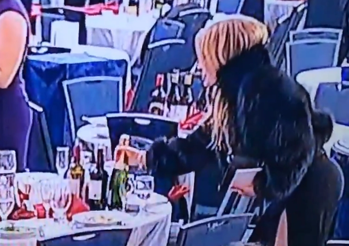 И она не одна. Судя по кадрам, несколько гостей воспользовались суматохой во время эвакуации, чтобы прихватить алкоголь с сервированных столов.