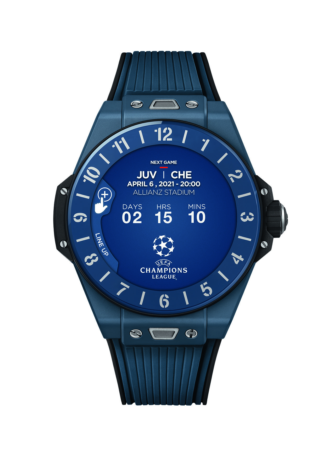 Легкий керамический корпус и каучуковый браслет ограниченной серией из 500 экземпляров выполнены в синем цвете Лиги чемпионов УЕФА