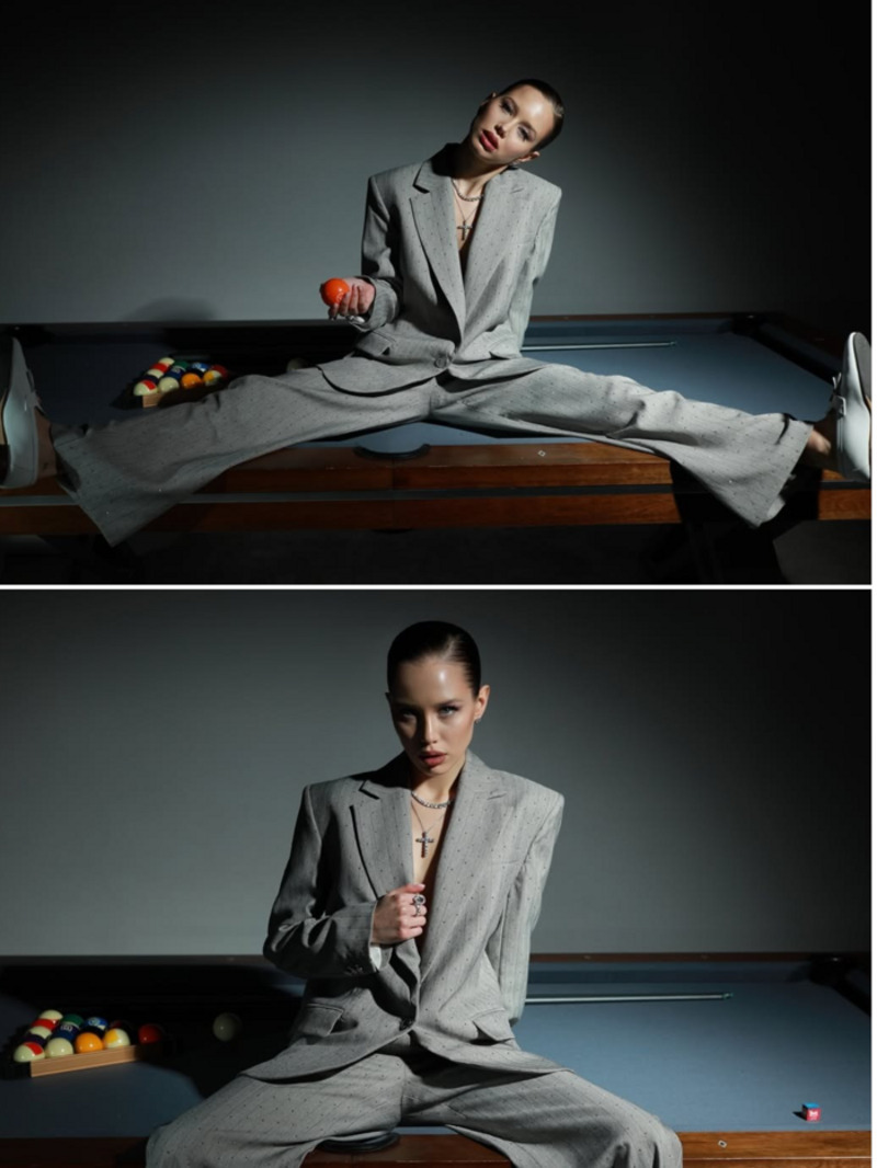 19-летняя блогерша облачилась в строгий костюм серого цвета. Пиджак Аврора надела на голое тело. Киба уверенно расположилась на бильярдном столе, держа в руках то шары, то кий. Ее собранные и приглаженные волосы отсылали к образу мафиози из старого кино.