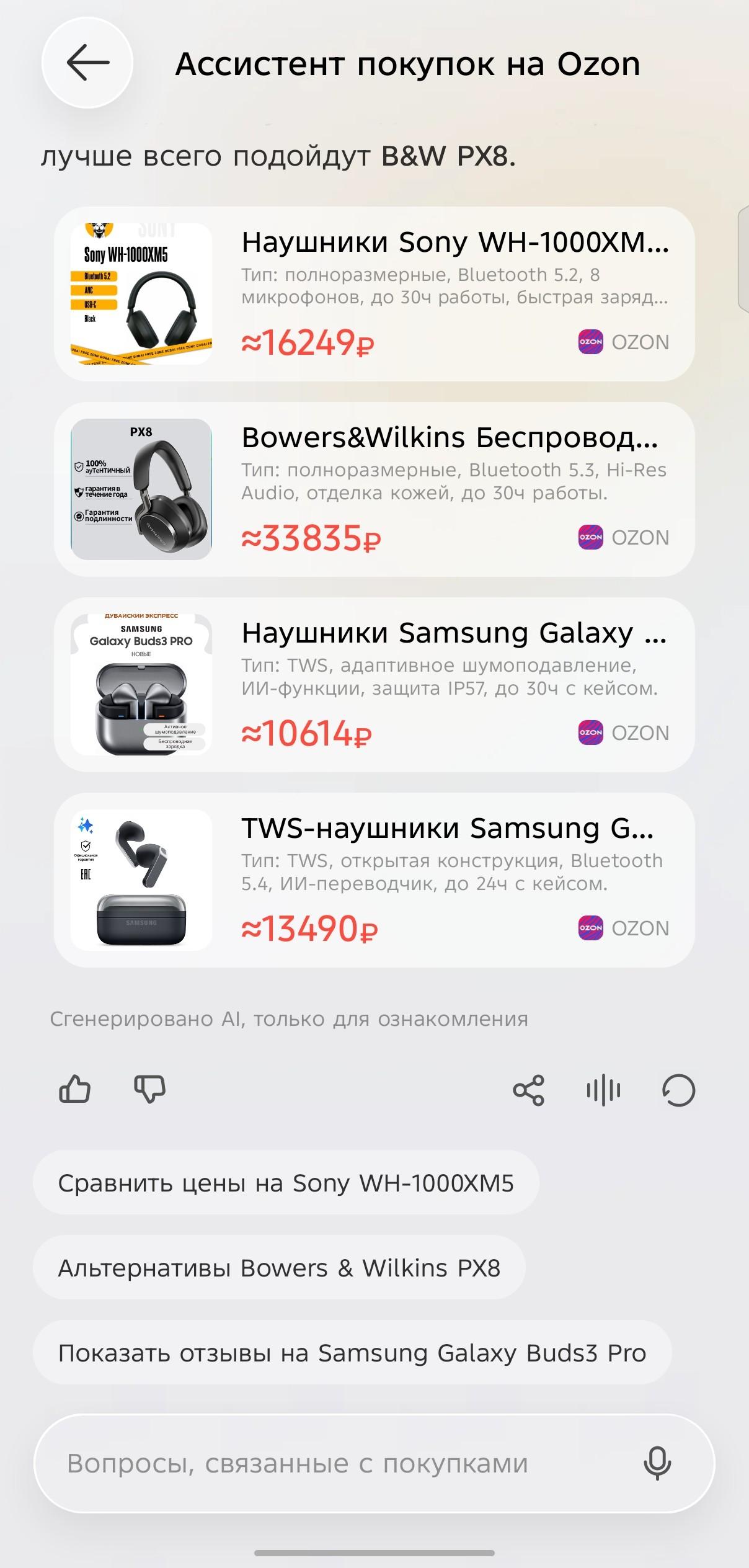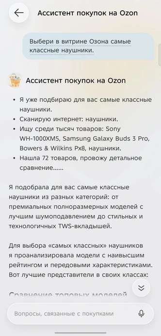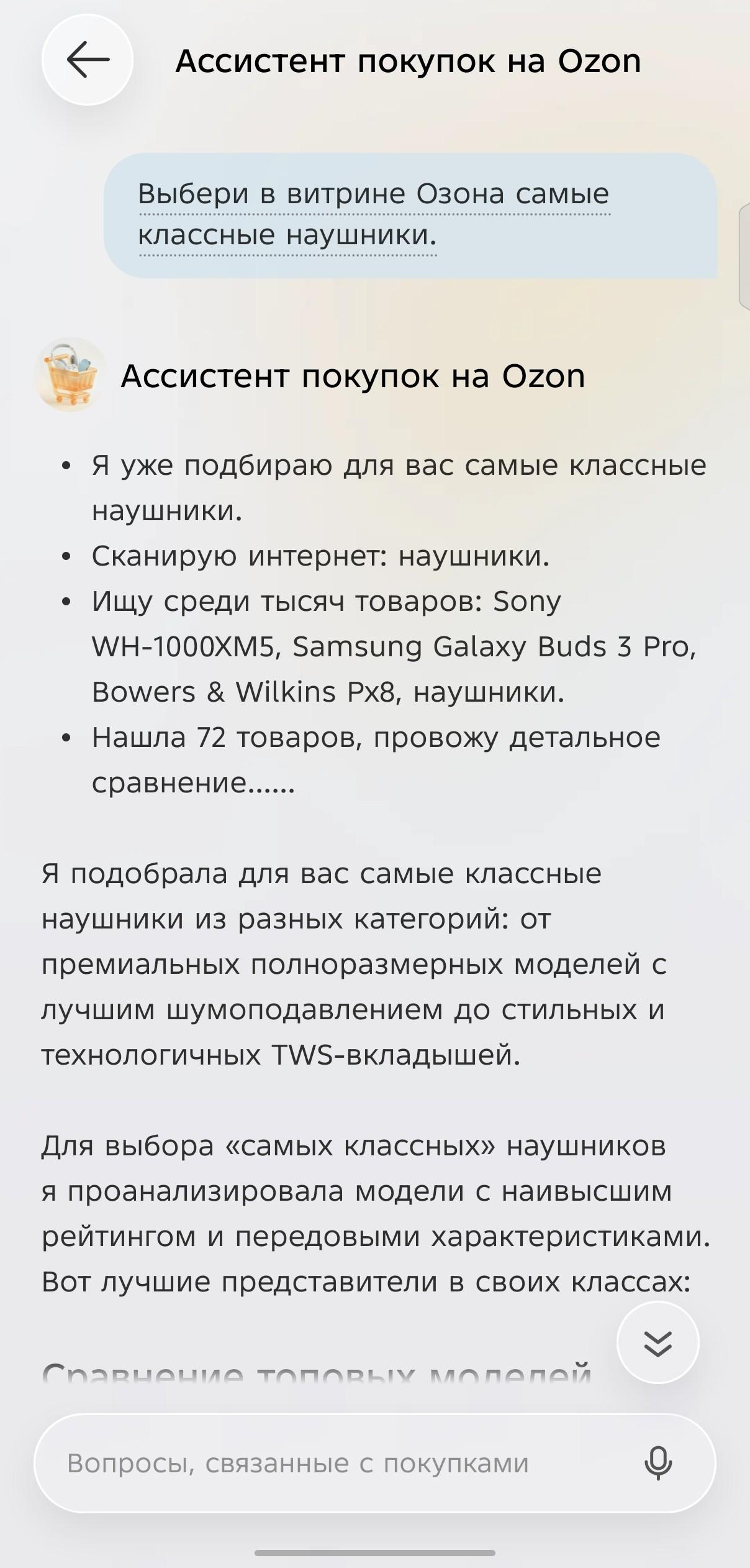 Ella и шопинг. Как же без покупок! Сможет ли наша виртуальная помощница справиться на этом поприще? Говорю команду: «Хочу купить наушники». Результаты отображаются на витрине OZON. Но предложений очень много, и по картинке явно не выбрать. Нужно сравнивать по техническим функциям, цене. Эту рутину Ella тоже берет на себя, достаточно попросить «сравнивать варианты по цене, техническим характеристикам или сделать обзор на модели». Вывод — ИИ-ассистент демонстрирует глубокую вовлеченность в вопрос, ответы выдаются не рандомно, а под запрос пользователя.