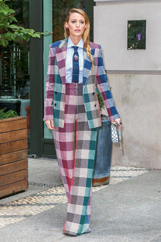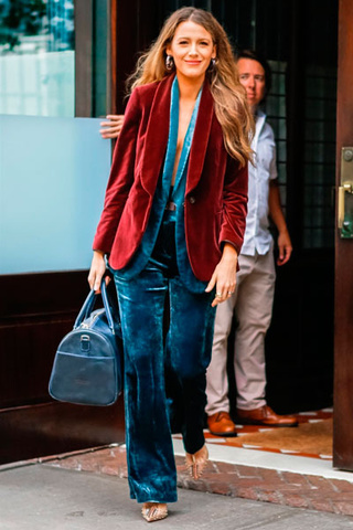 Так, в одном их последних выходов Лайвли явила на суд модной общественности брючный костюм в огромную разноцветную клетку. Образ смотрелся интересно и ярко, но совершенно нетипично для изящной Блейк. Вторым необычным решением стал бархатный костюм из брюк и жилета в модном сегодня оттенке зеленый квезаль, поверх которого звезда надела жакет кирпичного цвета. Учитывая тот факт, что все элементы образа были выполнены в бархатной ткани, образ смотрелся каким-то чересчур «плюшевым» и слегка перегруженным