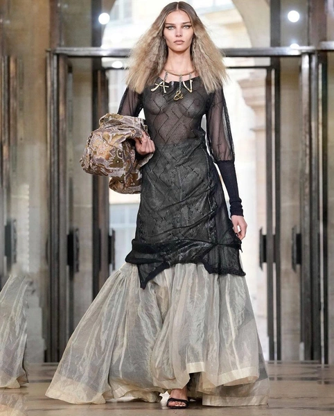 По работе в Париж прилетела и Алеся Кафельникова. Сначала русская красотка дефилировала у Weinsanto, затем на показе Гурама Гвасалии для Vetements, а потом повторила свой успех на Vivienne Westwood. После весеннего показа модного Дома все долго обсуждали новую грудь модели после маммопластики. И в этот раз ее образ был ее провокационнее.