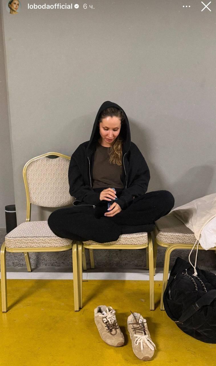 На опубликованном кадре Лобода выглядит совсем не так, как привыкли видеть ее поклонники на сцене. Никаких концертных платьев, сложных укладок и яркого макияжа. Певица сидит на двух стульях, поджав ноги по-турецки, в черных спортивных штанах и объемной толстовке с капюшоном