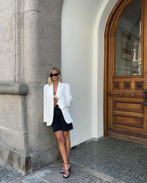 Белый пиджак — основа основ женского гардероба. Он выручит абсолютно в любой ситуации — его можно накинуть на плечи поверх атласного платья, а так же составить деловой образ с темными джинсами в рамках офисного дресс-кода. Но так как совсем скоро наступит пора вечеринок на летних верандах, советуем носить удлиненный пиджак пнадеть на голое тело вместо платья, как это делают Эмили Ратаковски и другие любительницы соблазнительных look'ов.