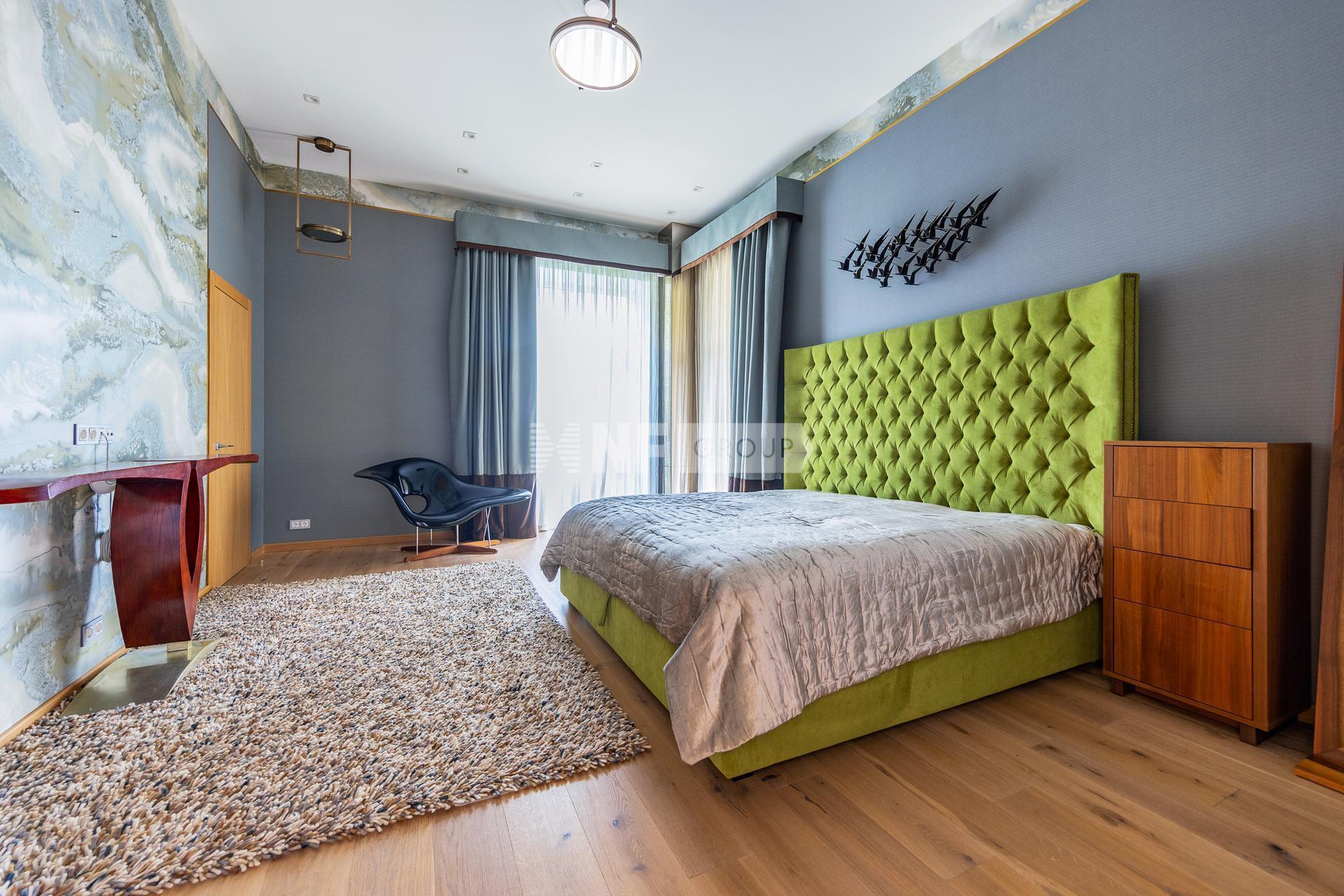 Каждая из четырех спален в этом особняке обладает своим характером и особыми деталями. В одной из них царит атмосфера уюта и покоя: здесь стоит большая двуспальная кровать с высоким мягким изголовьем насыщенного зеленого оттенка, а рядом необычный столик — предмет, который сразу притягивает взгляд и задает тон всему пространству.