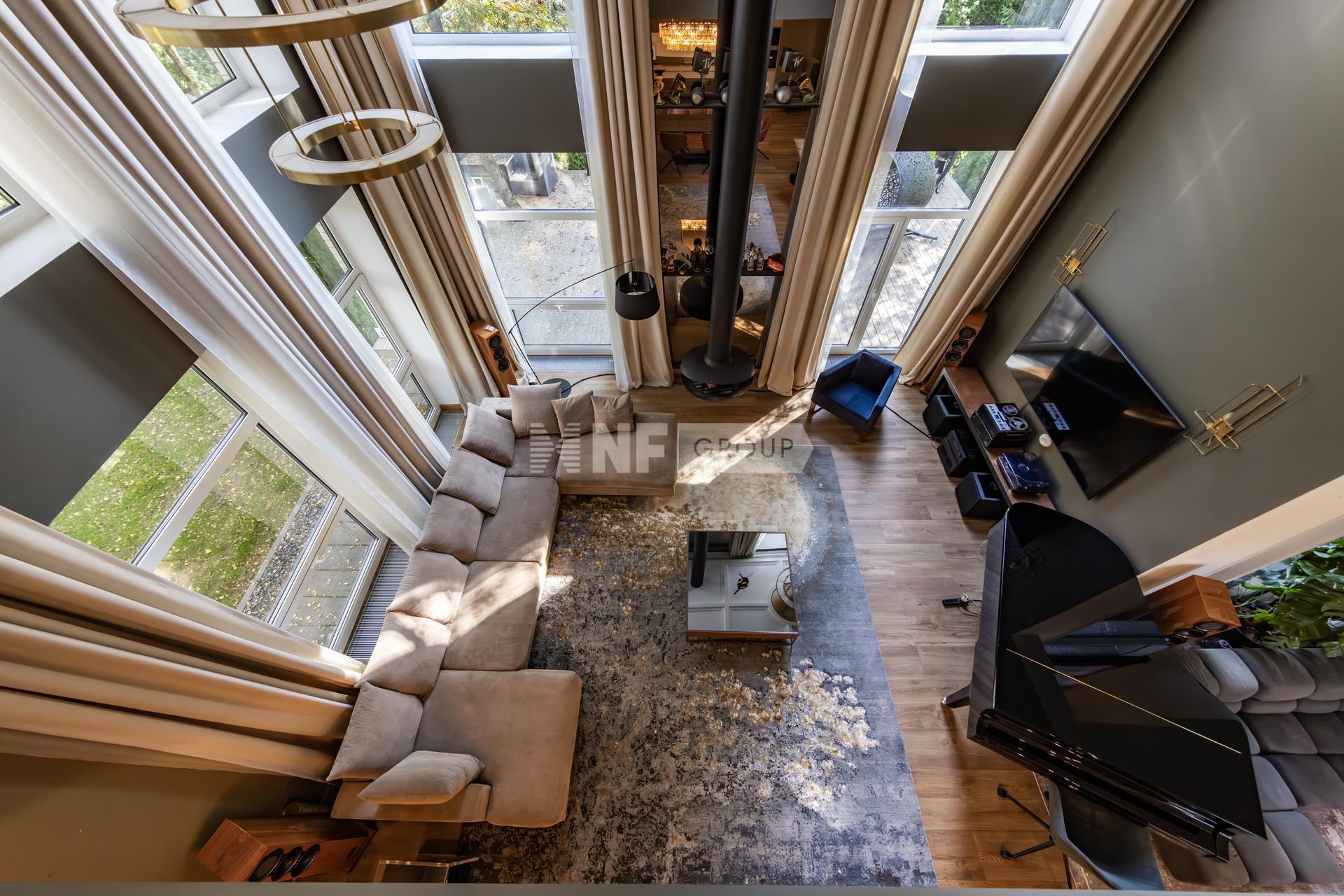 Сама гостиная поражает масштабом. Второй свет, открывающий пространство ввысь, наполняет комнату воздухом и свободой. Здесь есть все для души и отдыха: несколько уютных диванов, на которых можно смотреть телевизор или болтать с близкими, настоящий камин, создающий атмосферу тепла и уюта, и, конечно, рояль с музыкальной системой — напоминание о том, что этот дом принадлежал человеку, для которого музыка — не просто хобби, а сама жизнь.