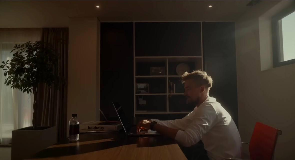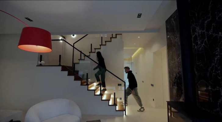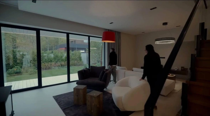 Интерьеры, судя по кадрам, выдержаны в современном минималистичном стиле с акцентом на свет и пространство. В гостиной — мягкая мебель светлых оттенков, камин с мраморной отделкой и панорамные окна, через которые в дом буквально льется дневной свет. Пространство выглядит одновременно строгим и уютным, ничего лишнего, но каждая деталь продумана. В одной из зон — эффектная красная лампа, которая добавляет интерьеру характер и визуальный акцент.