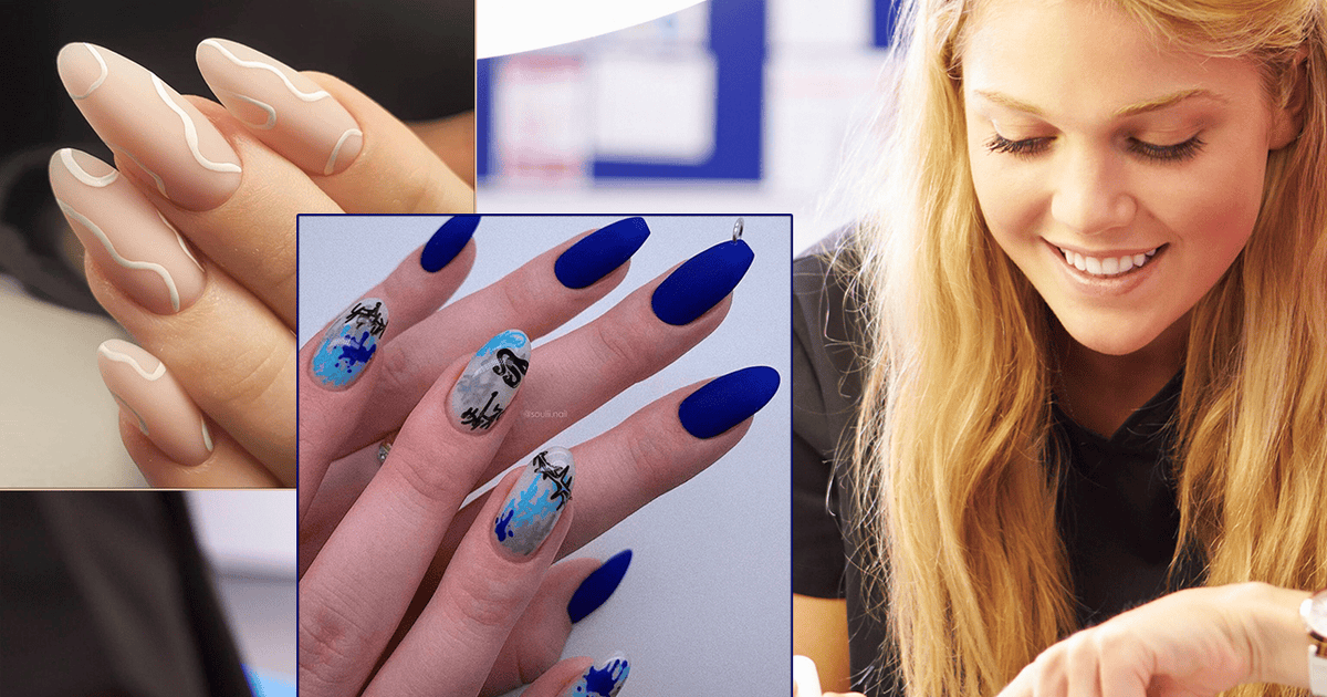 И снова синий, но более дерзкий. «Пирсинг» на среднем пальце и многочисленные граффити говорят нам о дерзком характере хозяйки ручек на фото. А еще у некоторых ногтей разная форма — но так было задумано. Кем работает эта девушка?