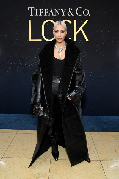 На ужине Кардашьян предстала в черном тотал-луке. Поверх обтягивающего топа и брюк звезда накинула кожаное оверсайз пальто — торжественности образу Ким придали сверкающие украшения. Особенно эффектно выглядело массивное колье в форме змеи.
