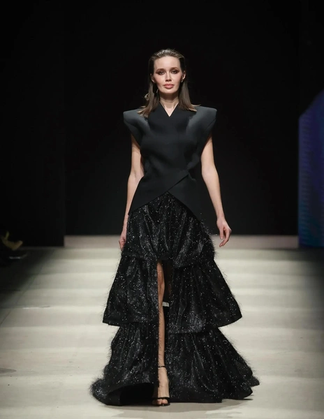 Среди них оказалась и Анастасия Костенко. Многодетная мама вышла на подиум в шикарном черном платье в пол. Верх наряда напоминал жакет без рукавов с выразительными подплечниками, на спине красовался глубокий вырез, а сияющая юбка переходила из мини в пышный многослойный подол