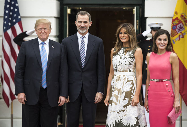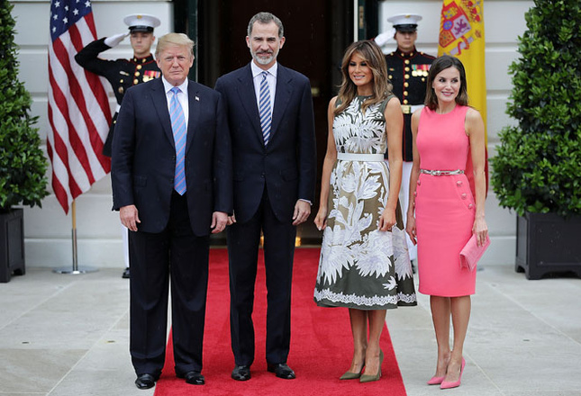 Президент США Дональд Трамп и его жена Мелания приняли в Белом доме высокопоставленных гостей – короля и королеву Испании Филиппа VI и Летицию. Дружеская встреча состоялась во время пятидневного тура европейских монархов по Америке в рамках празднования 300-летия городов, которые были основаны испанскими колонизаторами. Фотографии с мероприятия уже появились в сети и… наделали много шума. Все сравнивали наряды первой леди и королевы.