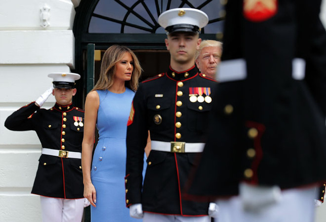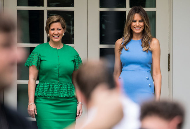 Оказывается, королева Испании выбрала наряд, в котором первая леди Америки появлялась на публике годом ранее. Только платье у Мелании тогда было не розовое, как у Летиции, а голубое. Обыграла его жена Дональда Трампа тоже по-другому: она носила наряд без пояса и не с однотонными туфлями, а разноцветными.