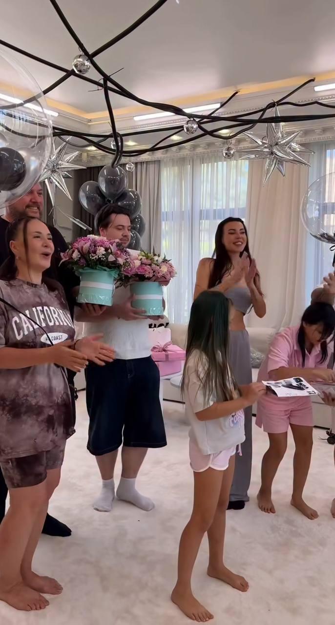 Празднование началось с небольшого, но трогательного домашнего сюрприза. На первом этаже дома собралась вся семья: родители, младшие сестры и брат. Гостиная была украшена в стиле luxury-гранж — черные, белые и серые шары, подвешенные костыли, а на лестнице ждала главная героиня дня.