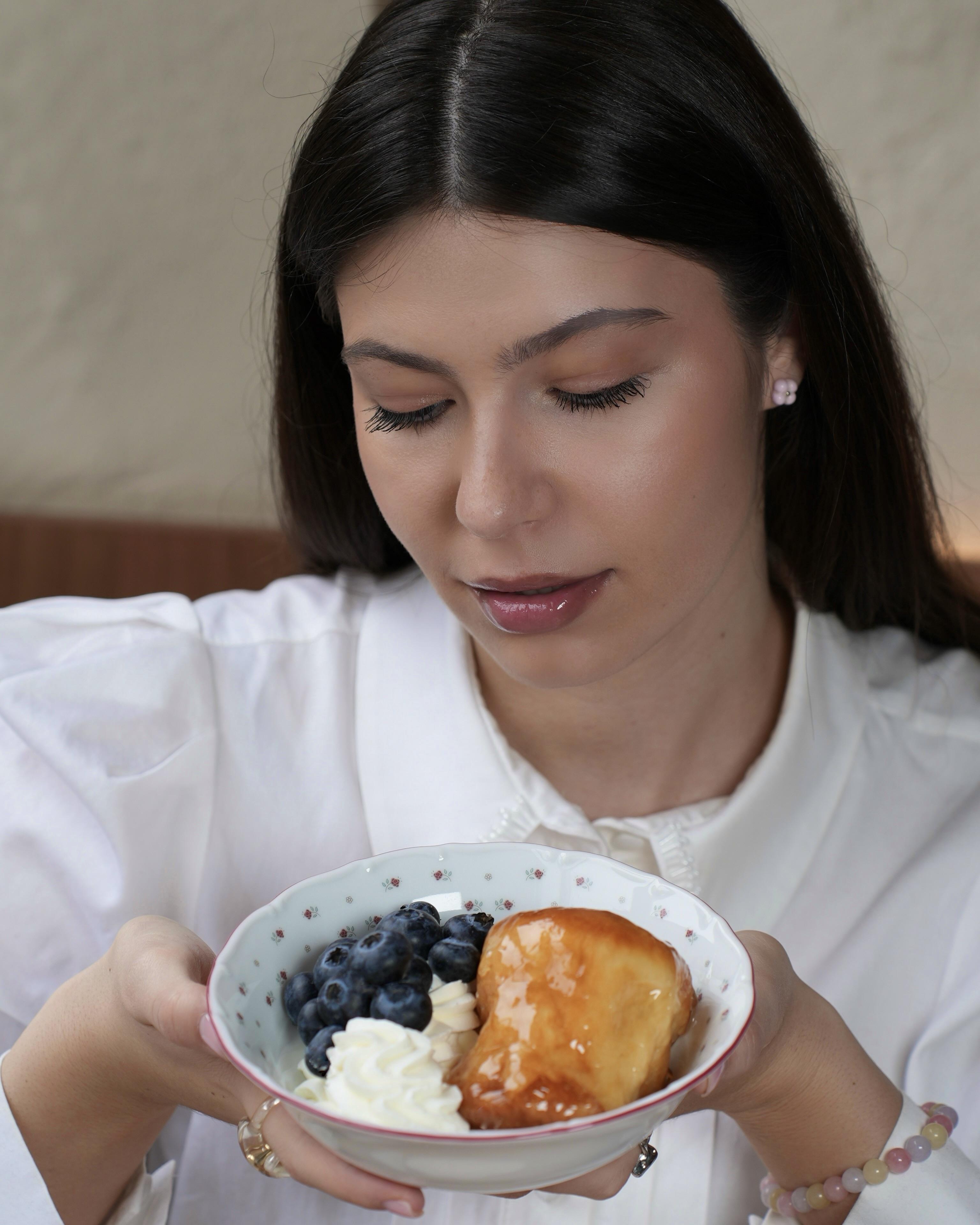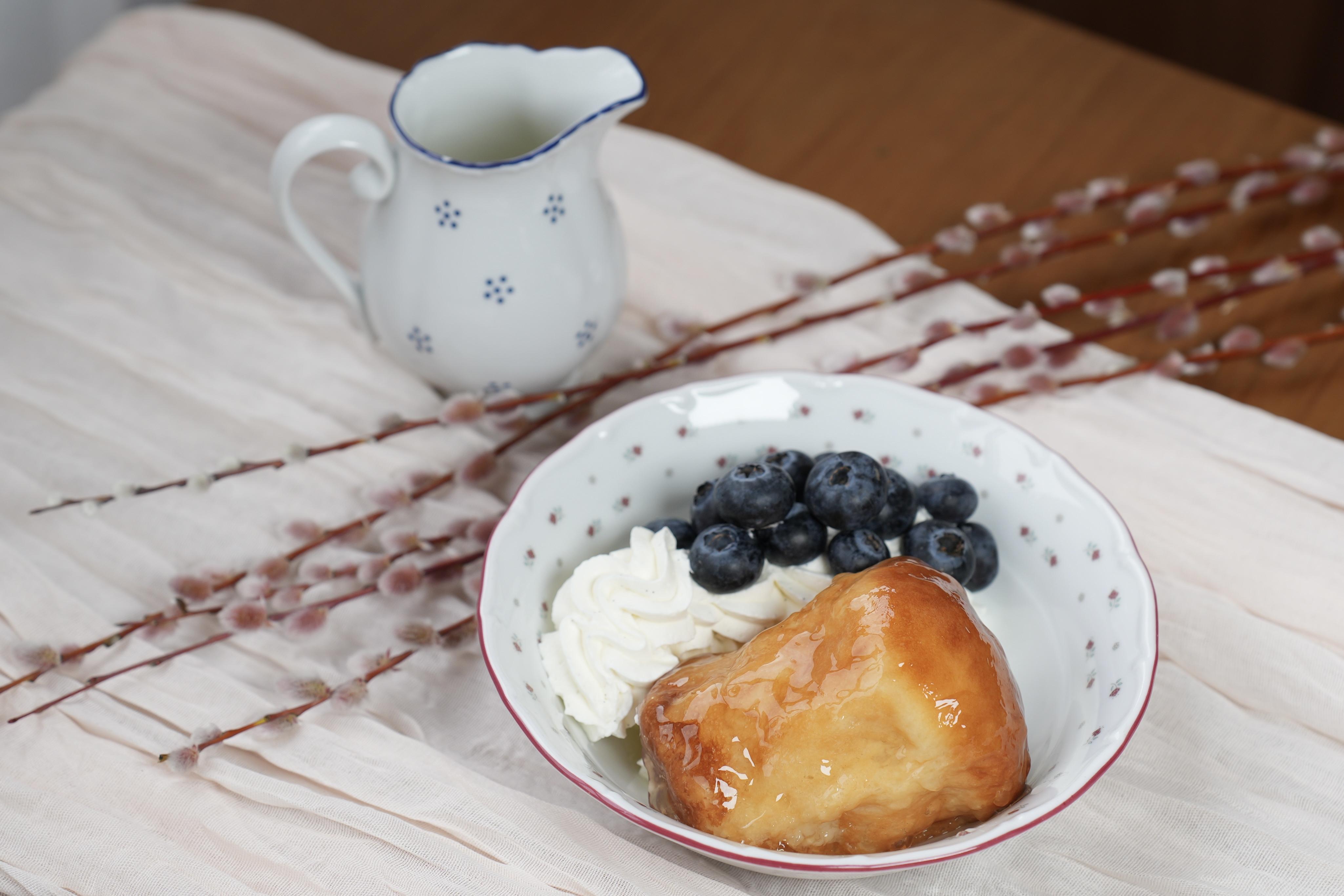 Он подается вместе с кремом шантильи и свежей голубикой, а финально украшают уже при подаче: babá поливают одним из соусов — апельсиновым на сливках с белым шоколадом или фисташковым с ванилью.