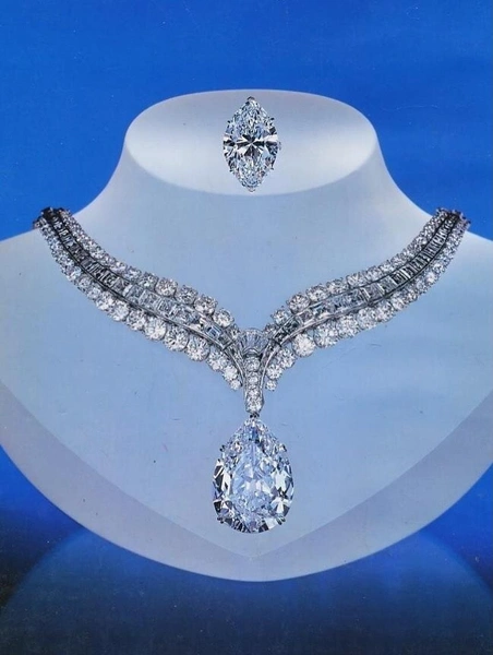 Украшение представляет собой ожерелье в форме буквы V, усыпанное бриллиантами, в центре которого сияет великолепный грушевидный кулон. Гости могли только догадываться об истинной ценности и происхождении данного камня. Это не просто крупный бриллиант, а легендарная «Звезда Востока» — камень весом 94,8 карата с безупречным цветом D и чистотой VS2, чья история насчитывает столетия и пересекается с судьбами султанов, королей и самых эксцентричных миллионеров.
