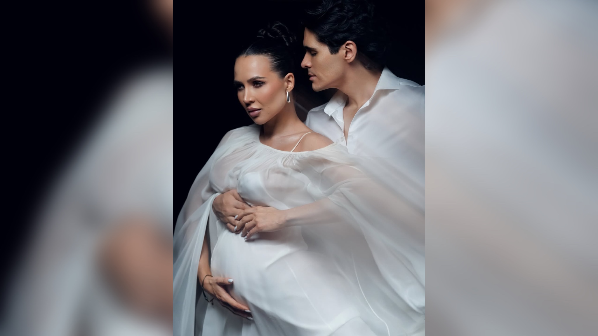 На видео будущие родители сидят на роскошном ковре среди заснеженных ёлок, делясь друг с другом волнением и радостью.