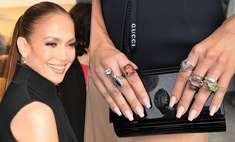 На фотоколл Лопес приехала в образе из круизной коллекции Gucci. Верхняя часть платья с пикантным декольте выполнена из неопрена, а юбка — из нескольких слоев нежного шифона. Как вы уже могли заметить, маникюр Джен был в тон платья: специально ради этого — в тот же день, за пару часов до мероприятия — Лопес заскочила в салон красоты.