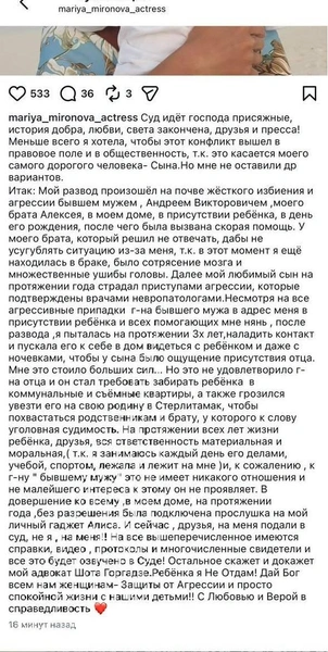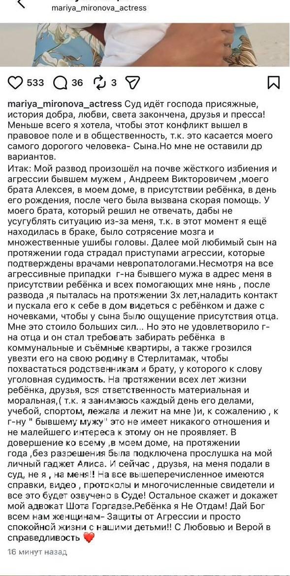 Все эти годы о жизни звездной семьи почти не было информации, и вдруг заявление: бывший муж подал на актрису в суд, потому что она не дает ему видеться с сыном. Тут же выяснилось, что они расстались еще три года назад, но предпочли умолчать об этом. Видимо, сейчас, между бывшими супругами произошло серьезное недопонимание, раз дело дошло до суда. Пока страна обсуждала случившееся, Мария Миронова решила высказаться: