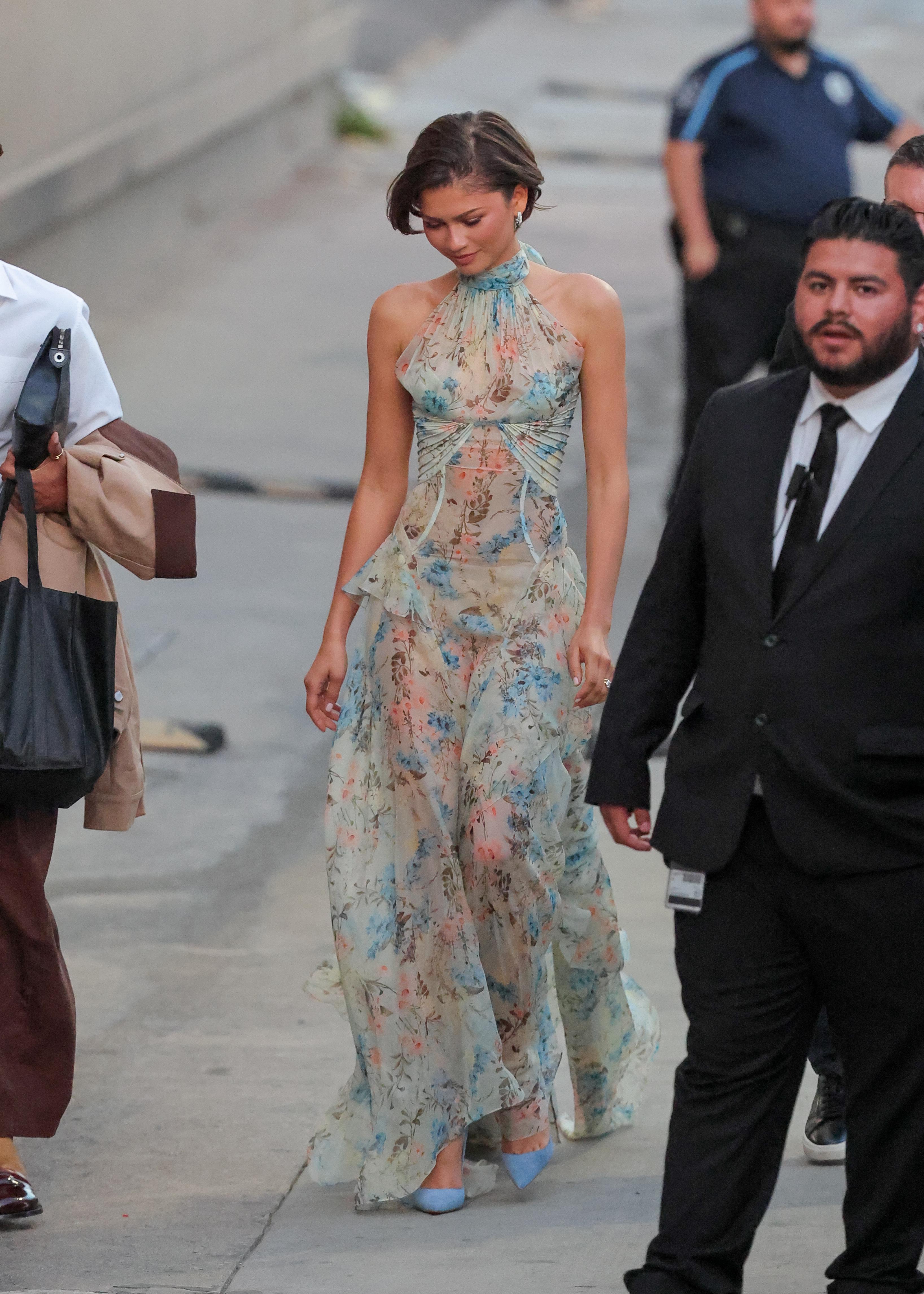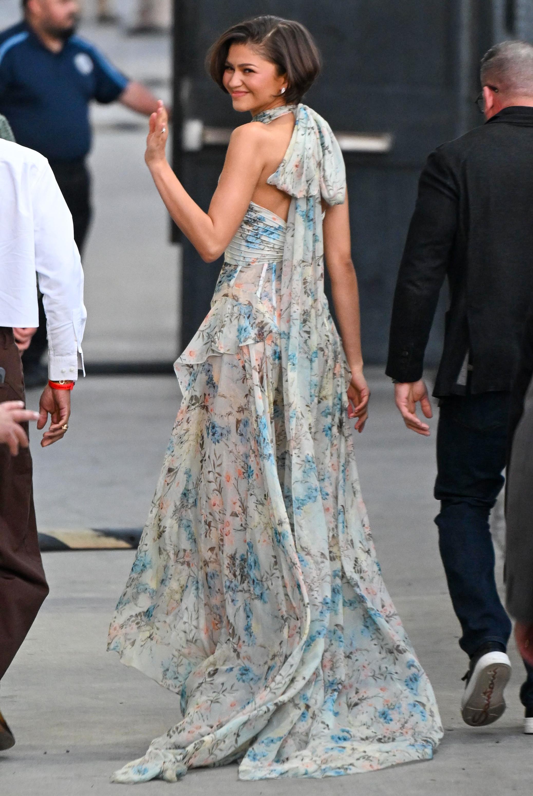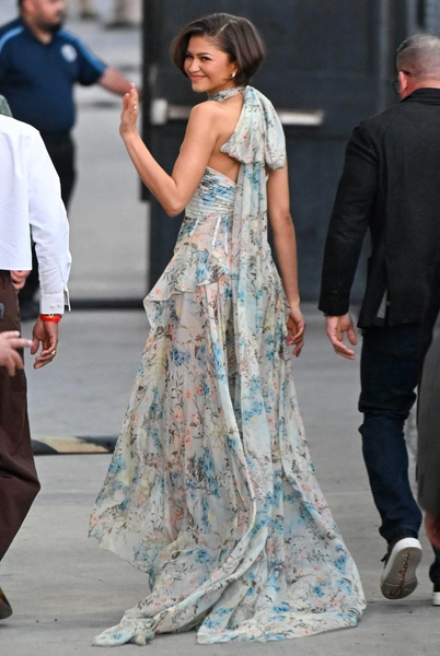 Уже через пару дней после этого Зендея стала гостей шоу Джимми Киммела и на съемках выглядела весьма по-весеннему. Она сделала ставку на легкое платье Moschino из новой коллекции бренда: не белое, а с синими цветами, и в этом тоже был особенный смысл. «Что-то белое, что-то голубое», — это часть британской свадебной приметы, у которой еще есть продолжение про «что-то новое, что-то старое, что-то взятое взаймы». Синий или голубой цвет в этом случае символизирует преданность и верность невесты любимому.