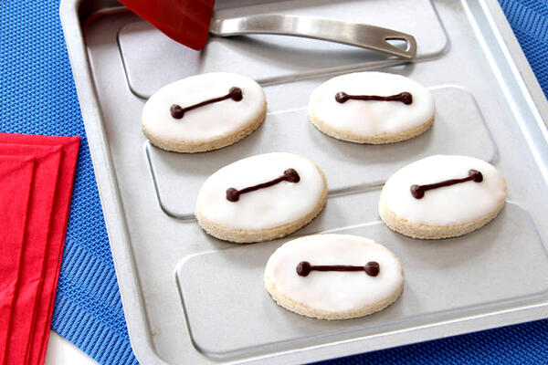 - С помощью зубочистки нарисуйте растопленным молочным шоколадом на каждом печенье глаза Бэймакса.