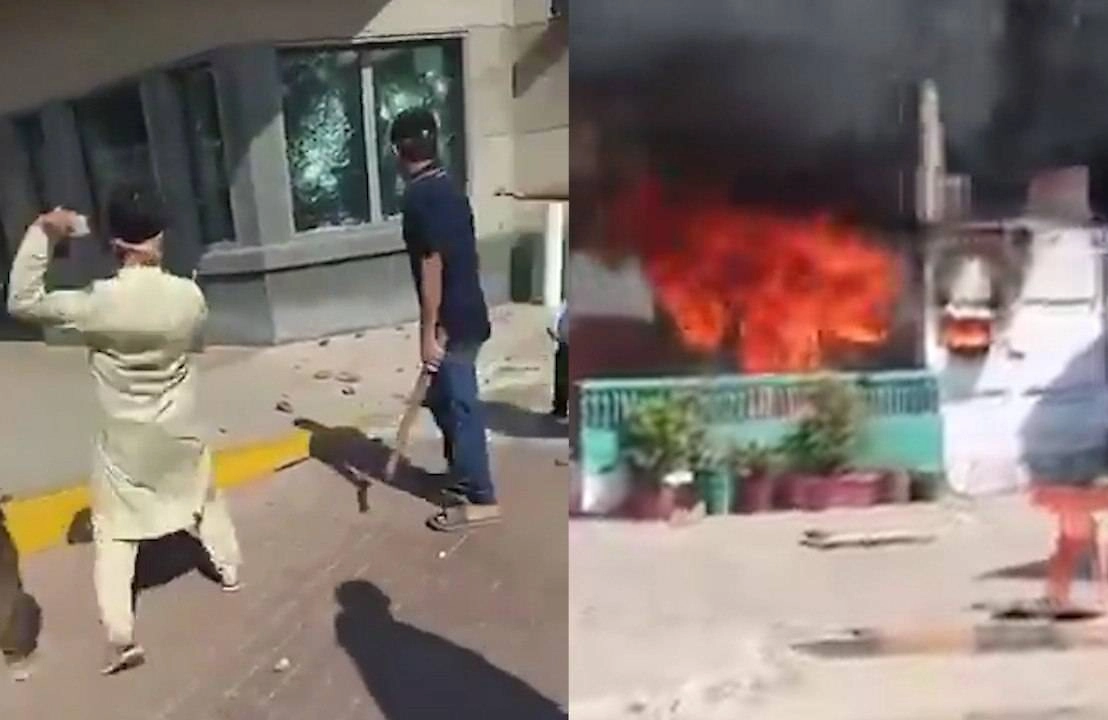 На видео — погромы, устроенные в районе диппредставительства. Видно, как протестующие ломают двери и разбивают окно. Также на месте возник огонь.