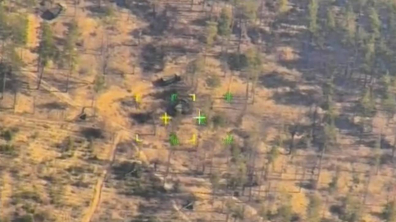 На ролике видно, как огневые позиции артиллерии ВСУ, скрытые в лесном массиве, были разведаны беспилотным летательным аппаратом, после чего по ним был нанесён удар.