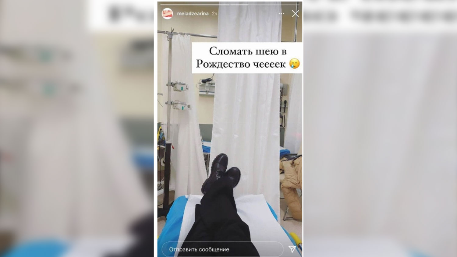 Арина опубликовала два фото. На одном из них виден интерьер в бежевых тонах, указана локация клиники и подпись: "Прекрасное начало нового года". На втором кадре дочь Меладзе показала свои ноги на койке в больничной палате и написала: "Сломать шею в Рождество чеееек (от англ. check — "поставить галочку". — Прим. Лайфа)"